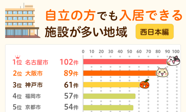算出方法:西日本(静岡・愛知・岐阜・富山・石川・福井・大阪・京都・兵庫・奈良・三重・滋賀・和歌山・岡山・鳥取・島根・広島・山口・香川・徳島・愛媛・高知・福岡・佐賀・長崎・大分・熊本・鹿児島・沖縄)に所在する、自立の方でも入れる介護施設数を算出