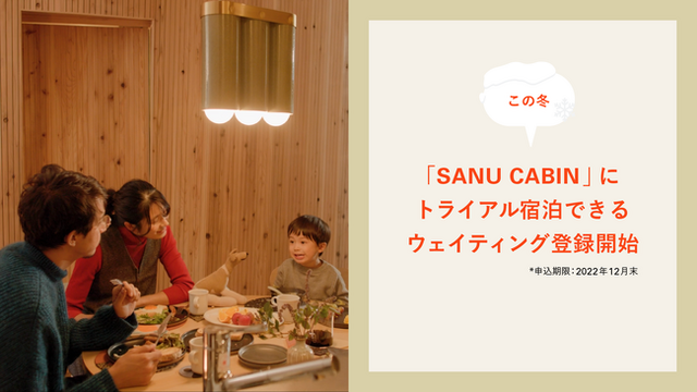 都市から自然に繰り返し通うライフスタイルを提案する、セカンドホーム・サブスクリプションサービス「SANU 2nd Home(サヌ セカンドホーム)」(運営元:株式会社Sanu、本社:東京都中央区/代表:福島 弦)は、サービスを共に育んでくださる皆さまのお陰で、本日2022年11月11日にグランドオープンから1周年を迎えました。2年目を迎える冬のテーマは「Winter to Love」-- 大切な人と過ごす“冬のキャビンの楽しみ方”のご提案や、滞在をあたたかに彩るプレゼントを滞在者全員へ用意いたしました。さらに、1周年を記念し「自然の中のもう一つの家」に”この冬”滞在いただける、トライアル宿泊付きウェイティング登録を本日より開始いたします。いつもと違う、自然の中での冬の暮らしをお楽しみください。