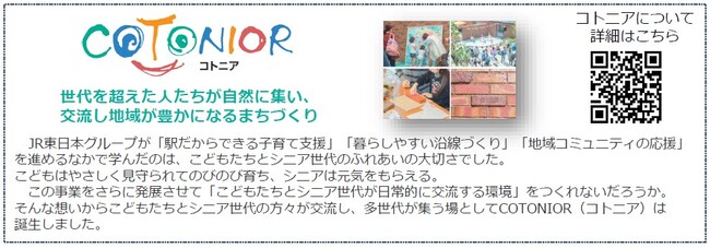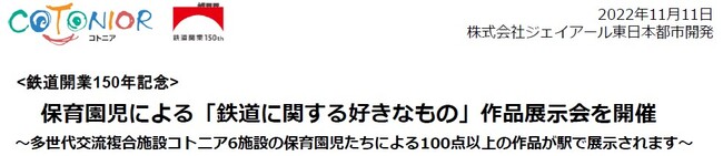 2022年11月11日(金)~12月15日(木)鉄道開業150周年を記念して、コトニア吉祥寺、赤羽、西船橋、越谷レイクタウン、武蔵浦和、コトニアガーデン新川崎の保育園児が作成した「鉄道に関する好きなもの」をテーマとした作品展示会を開催いたします。「COTONIOR(コトニア)」は「子ども(codomo)」+と(to)+シニア(senior)」から生まれた造語で、JR東日本グループが推進する子育て支援と高齢者福祉の複合施設です。