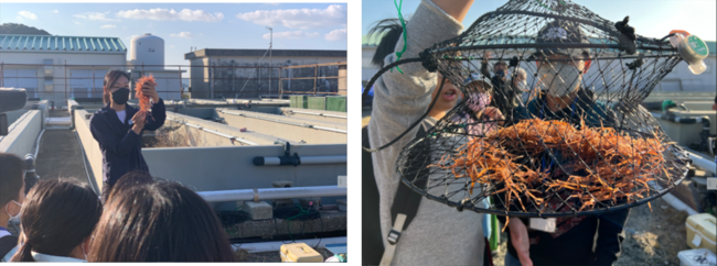 海藻の保全方法の一つに養殖があります。今回は、トサカノリの仲間である海藻のミリンを使って、3ヵ月間にどのように生長するのかを観察します。実験の監修をした熊本県水産研究センターの竹内美彌子研究員は、トサカノリを増やすための養殖方法を研究している方で、今回は過去の実験の成功例を基にして生長が見込める条件を設定しました。班ごとに200gずつ4つの網に分けたミリンは、海に沈める深さなどを変えて経過を観察します。期間中は各網付近の海水温や照度の変化を記録します。