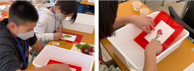 実際に海藻を初めて触ったという子は、感触が「プチプチ、ヌメヌメする」ことも体験しました。「海藻おしば」は赤や緑の海藻6種類を使い、水に沈めた紙の上にピンセットで海藻を広げながら並べ、形を整えます。子ども達は、作業に没頭し、個性豊かな作品が次々と出来上がりました。次回の12月3日には、完成した海藻おしばに、今回の学びで得たことをメッセージとして添えるやり方で「オリジナル感想海藻サラダ」のパッケージをデザインする予定です。