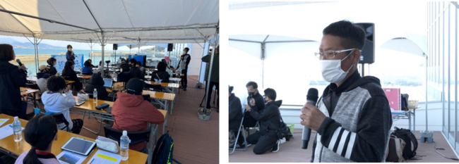 最初の座学では、九州大学理学部附属天草臨海実験所の新垣誠司准教授が天草の海の特徴である多様性について解説をしました。続いて、素潜り漁師として通詞島で25年ほど海の変化を見てきた松本千恵人さんに体験談を聞きました。松本さんが実際に潜っている映像をモニターで見ながら、トサカノリの生息域や漁の方法などについて教えてもらいしました。年々減っているトサカノリを守る対策としての漁の制限や、胞子による受精の機会を増やす取り組み、トサカノリが減った原因の一つであるウミアザミの駆除について詳しく聞きました。