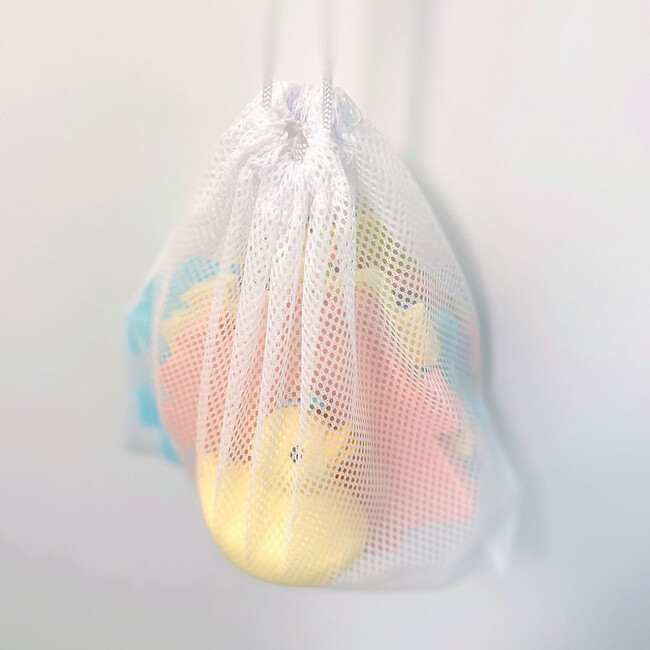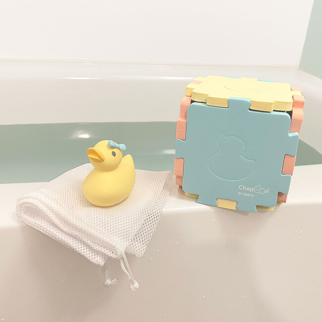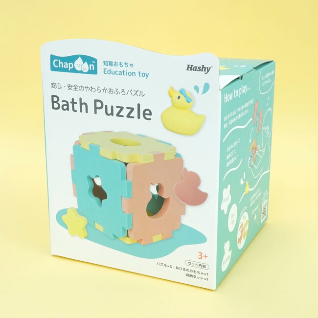 小さなお子様でもお風呂で安心してお使いいただける、軽くてソフトな触り心地のパズル(6枚入)とあひるのおもちゃ、保管に便利な収納ネットがセットに!