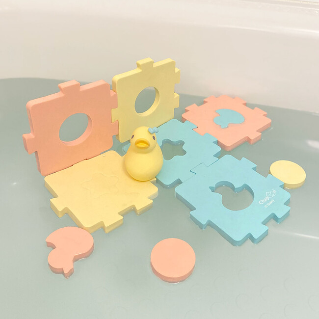 全てのパズルには型抜きができるように、丸や星、あひるの切り抜きがあり、お風呂で楽しみながら遊べます。またパズルは連結できるので、6枚繋げれば小さなバスマットとしてもお使いになれます。
