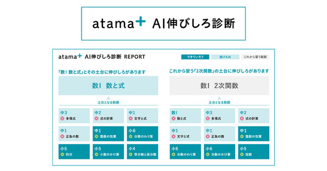 「atama+ AI伸びしろ診断」は、算数と数学における受験や定期テストに向けた課題をAIが分析し、伸びしろを明らかにする、学習理解度診断テストです。