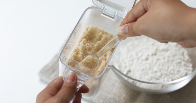 材質 : ケース/スチロール樹脂、フタ・すりきり板・スプーン・ボタン/ABS樹脂、パッキン/シリコーンゴム