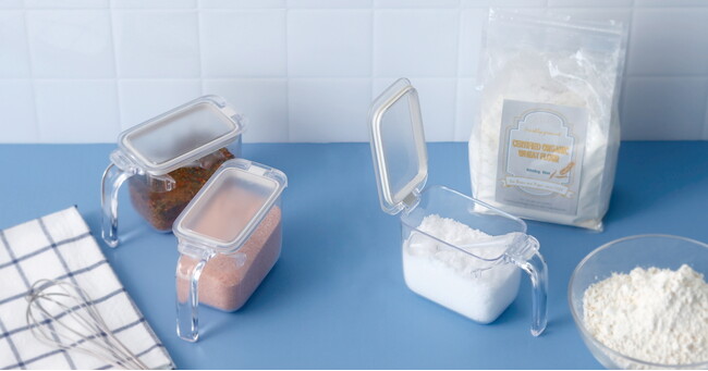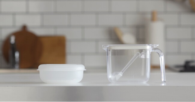 「調味料ポット」は、密閉性とワンタッチオープンなどの操作性を兼ね揃えた調味料入れです。シリコーンゴムのパッキンで湿気を防ぎ、調味料が固まりにくく、手元のボタンを押すとしっかり閉まっていてもワンタッチで開きます。既存の調味料入れは、持ち手側にフタが開くのに対し、「調味料ポット」はフタが奥に開くため、調理中もさっとすくえます。容器の内側にはすり切り板が付いており、付属のスプーンで小さじ1杯分を簡単にすり切りれます。スプーンは、すり切り板に立て掛けると調味料に埋もれず収納できます。