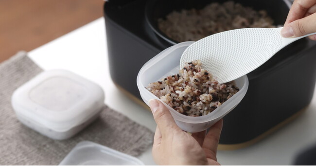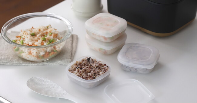 「極 冷凍ごはん容器」は、ご飯1膳分(約180g)の冷凍保存用の容器です。炊いたご飯を小分けにして冷凍保存しておく方が多いことから、電子レンジで温めた際のご飯の美味しさにこだわり開発しました。底にセットした「すのこパーツ」の上にご飯を入れるため、温めた際にはスリットから余分な水分が下に落ちて、容器の底のご飯のベタつきを防ぎます。また、薄く角を丸みのある形状にすることで、ムラなくふっくらとご飯を温められるようにしました。角が丸い形状により、ご飯を入れやすく、洗いやすい点も特長です。
