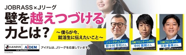就活には、壁がつきものです。思いどおりにいかず、挫折を味わうこともあるかもしれません。今回、お招きする特別ゲストの方々、数々のプレッシャーや壁に挑み続けてきた経験をお持ちです。就活本番を前に、就活生が知っておくべき行動と思考のヒントがあるのではないでしょうか。JOBRASSとJリーグのコラボによる、一夜限りのオンライン特別セミナー。「壁を越えつづける力」について、お話しいただきます。