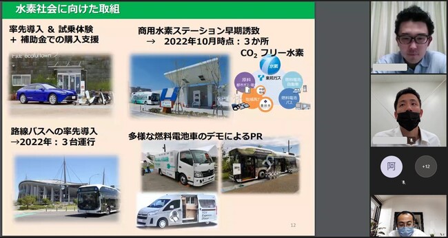 勉強会には、6つの高専の学生・教職員約20名がオンラインで参加し、講師である豊田市役所未来都市推進課の職員の方より、スライド資料を用いてご説明いただきました。カーボンニュートラルを巡る日本・世界の動向から、具体的に豊田市役所と企業などが連携して取り組まれている施策、現在課題として自治体が悩んでいる事柄など、多くの内容を丁寧にご説明いただき、これまで知る機会の少なかったカーボンニュートラルに対する自治体の取組実態を学ぶことができました。