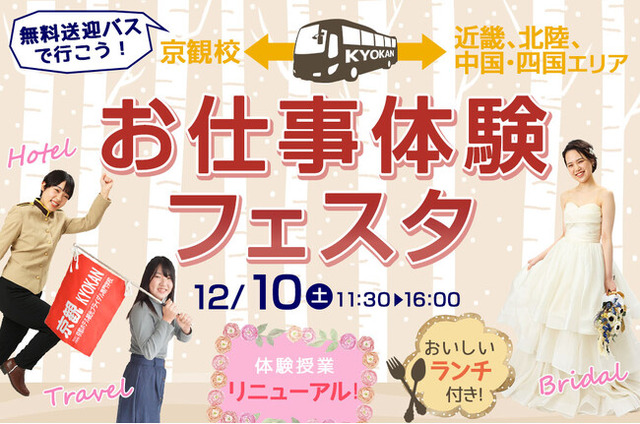 京都ホテル観光ブライダル専門学校は、2022年12月10日(土)にオープンキャンパス「お仕事体験フェスタ」を開催します。 今回のオープンキャンパスでは遠方の方も気軽に参加できるよう、JR福井駅・敦賀駅・長浜駅・彦根駅・草津駅・西舞鶴駅・綾部駅・福知山駅・坂出駅・岡山駅・高松駅・徳島駅・豊岡駅・丹鉄峰山駅・丹鉄宮津駅、洲本ICからの無料送迎バスを運行します。また、京都市内高級ホテルと企画した京観オリジナルお弁当付きの特別イベントです。