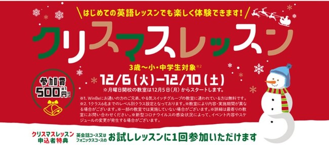 総合教育サービス事業の株式会社やる気スイッチグループ(東京・中央区、代表取締役社長:高橋 直司)が展開する子ども向け英語・英会話スクールのWinBe(R)(ウィンビー)は、幼児(3歳以上)から小学生・中学生を対象に、クリスマスをテーマにネイティブスピーカーの講師と楽しく英語が学べる「クリスマスレッスン」を2022年12月6日(火)~12月10日(土)の5日間限定で開催します。(1回50分レッスン・税込500円)。通常レッスンの内容に加えて、クリスマスに関する単語を使ったゲームやクラフトなど、楽しいアクティビティが満載。楽しみながら英語を定着させます。また、参加者特典として通常レッスン1回分をプレゼントします。
