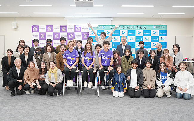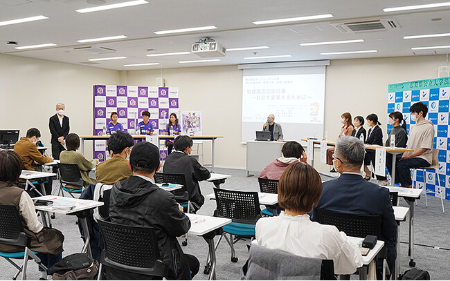 令和4年11月8日(火曜日),叡啓大学にて,サンフレッチェ広島レジーナの呉屋絵理子選手,中村楓選手,川島はるな選手3名をゲストにお招きし,連携講座「包括協定記念行事-社会を変革するために-」を開催しました。