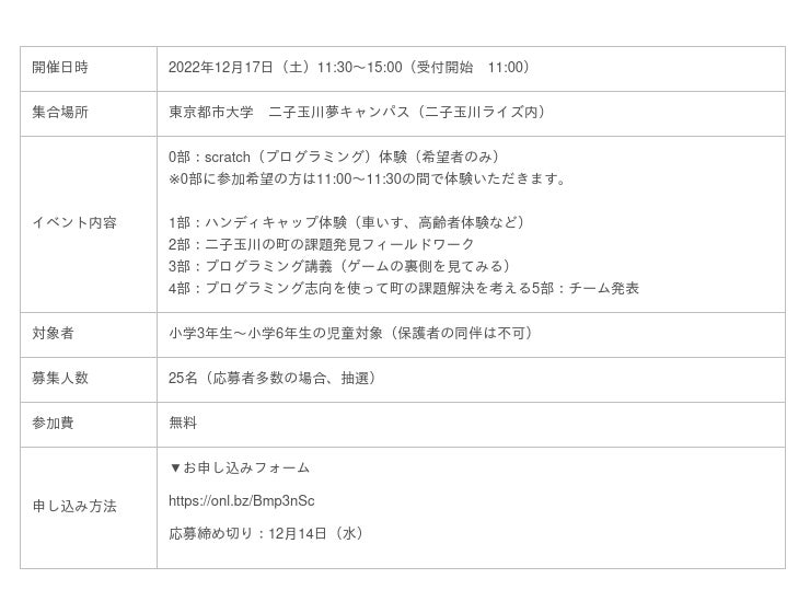 Adecco Groupの日本における事業を統括するAdecco Group Japanは、二子玉川エリアに住む小学生を対象に、プログラミング授業と町中でのフィールドワークを組み合わせた体験型イベント『ぷろぐライク』を開催します。本イベントは、Adecco Group、株式会社東急エージェンシー、東京都市大学都市生活学部 西山敏樹研究室、一般社団法人二子玉川エリアマネジメンツの4者が合同で企画を行い開催します。