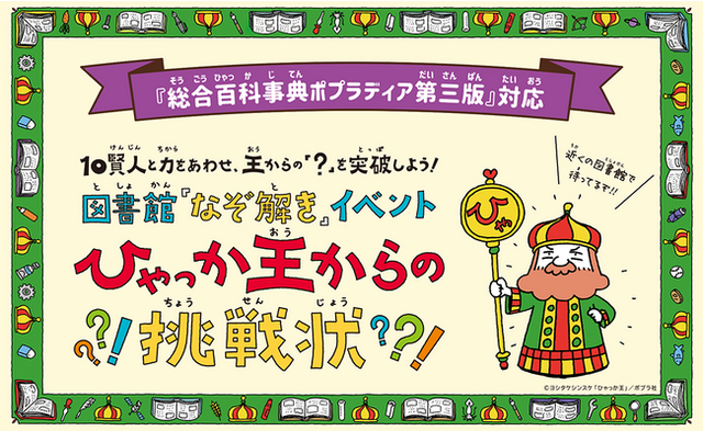 人気絵本作家・ヨシタケシンスケさんデザインの「ポプラディア第三版」イメージキャラクター「ひゃっか王」がナビゲートする図書館向けイベントです。