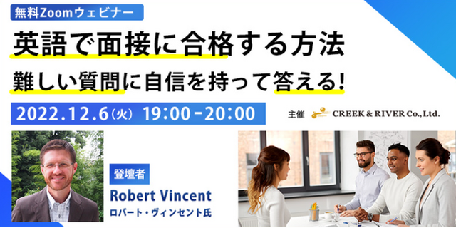 講師を務めるのは、これまで数百人におよぶ学生に英語でのコミュニケーションスキルや面接テクニック指導を行ってきたロバート・ヴィンセント氏です。「あなたの弱みを教えてください」という質問に対して、英語で最適な表現ができるようになるための戦略と語彙を教えていただきます。“より良い言い回し”と“使ってはいけない言い回し”など、すぐに役立つ英語面接テクニックが満載の内容です。ご興味をお持ちの方はぜひご参加ください。