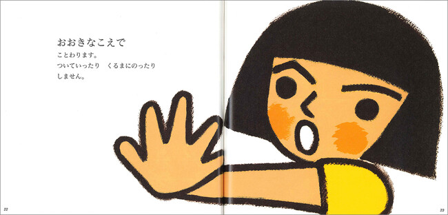 自分の体と心はたった一つの大切なものであること、プライベートゾーンを「水着でかくす部分」とわかりやすく伝え、そこをさわろうとしたりする大人がいたら、はっきり「やめて」と声を出そう、大人に話そう、と読者の子どもたちに語りかけています。
