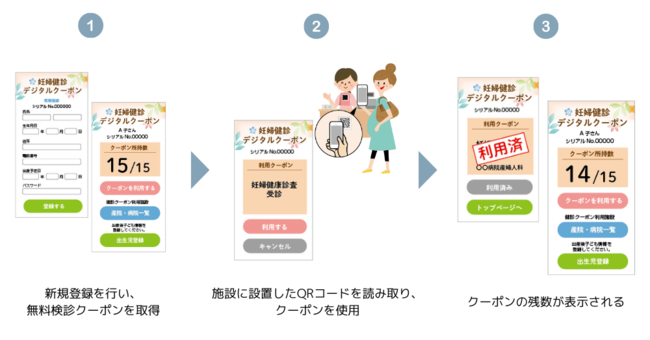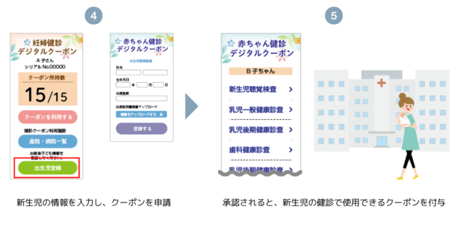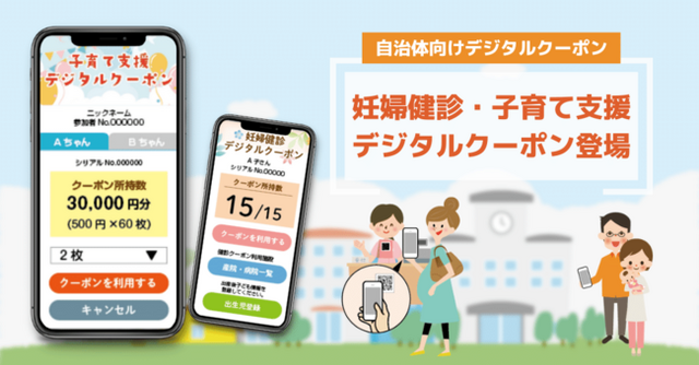 「妊婦健診デジタルクーポン」は、産院や病院で利用できる無料健診クーポンを配布し、妊婦健診・新生児健診が必要な母子の未受診者の把握やフォローを可能にします。「子育て支援デジタルクーポン」は、子育て支援サービスや育児グッズの購入に使えるクーポンに家族間で利用できる仕組みを入れ、子育て世帯の経済的負担を軽減するものです。