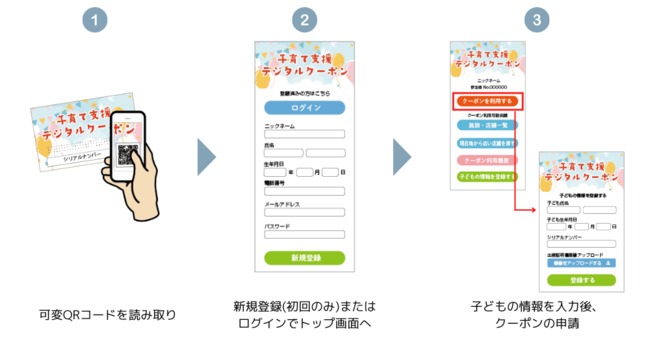 出生届の提出時、可変QRコードが記載されたシリアルカードを対象者に配布。スマートフォンから新規登録後、マイページから子どもに関する情報を入力して申請してもらいます。自治体側で子どもの実在を確認後、クーポンが配布されます。