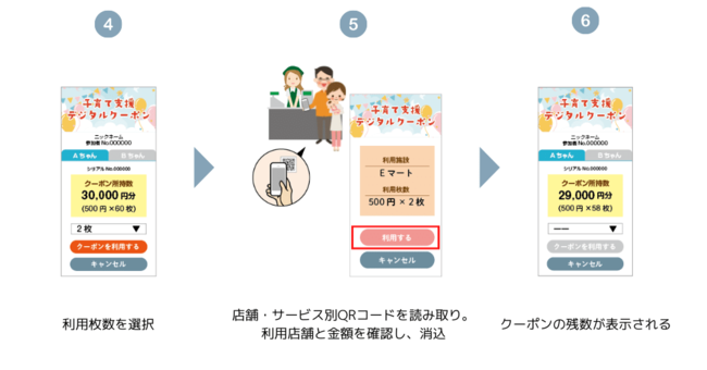 枚数を選択後、店舗・サービス別QRコードを読み取ってクーポンを利用します。利用後はクーポンの残り金額をマイページから確認する事ができます。