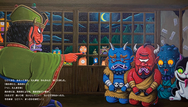 殿様におばけ退治をいいつけられた豪傑がやってきて、次々とおばけたちをやっつけます。おばけの子どもたちもこわくてふるえています。