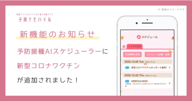 2022年2月より小児、2022年10月下旬より生後6ヶ月~4歳までを対象とした新型コロナワクチンの公的接種が順次開始されたことを受けて、子育て支援アプリ「子育てモバイル」の予防接種AIスケジューラーに「新型コロナワクチン」を追加しました。