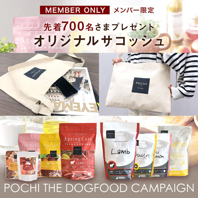 ・対象:POCHIザ・ドッグフード エイジングケアもしくはベーシック、ウェットいずれか7,700円(税込)以上ご購入の方先着700名さま