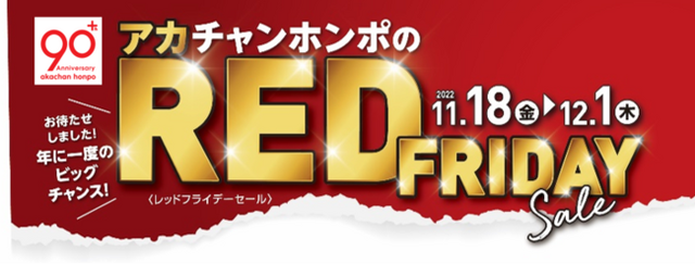 創業90周年を迎えた株式会社赤ちゃん本舗(本社:大阪市中央区 https://www.akachan.jp)は、年に一度のお得なセール「レッドフライデー」を、2022年11月18日(金)から12月1日(木)まで、全国のアカチャンホンポとオンラインショップ(https://shop.akachan.jp)で開催いたします。