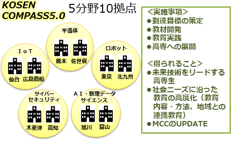 ※国立高等専門学校機構では、GEAR 5.0(未来技術の社会実装教育の高度化)とCOMPASS 5.0(次世代基盤技術教育のカリキュラム化)の2つのプロジェクトから構成される、高専発!「Society5.0型未来技術人財」育成事業を、令和2年度から進めています。COMPASS 5.0は、デジタルトランスフォーメーション(DX)時代に向け、あらゆる産業においてITを今以上に活用することが求められる中で、AI・数理データサイエンス、サイバーセキュリティ、ロボット、IoT、半導体という分野を、これからの技術の高度化に関する羅針盤(COMPASS)と位置付け、高専教育に組み込むことで、新たな時代の人材育成機関としての高度化を図るものです。
