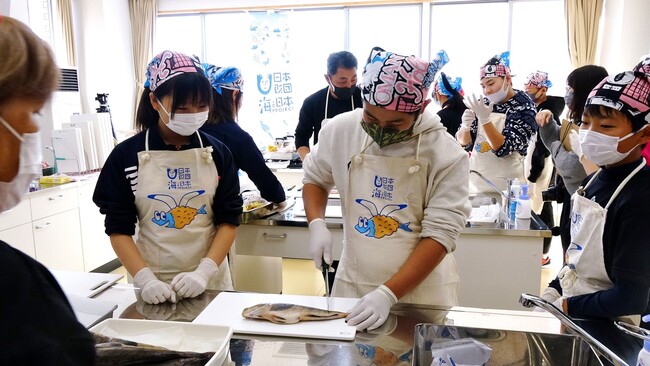 ・開催概要:小学校の家庭科調理室にて、講師によるマンツーマンでの指導を受け、地元産「ろうそくホッケ」を一から捌いて三枚おろしにし、ホッケカツを作ります。さらに、ホッケミンチ入りのカレーライス「魚っ子カレー」を作り、ホッケカツを乗せて「ホッケカツカレー」にして全員で食べます。