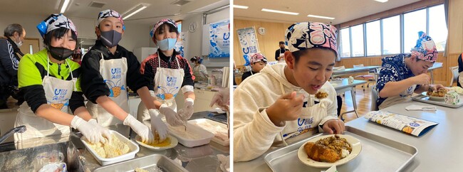 まずはホッケカツを実食。サクッといい音が聞こえてきました。なかには3杯もおかわりした児童もいました!実は、その児童は魚が嫌いな子でした。学校からすぐそばに見える、わいど(私たち)の海に住む魚を、自分の手で捌いて調理して食べたから、苦手だった魚のおいしさに気づけたようです。この体験が「豊かな海を守ることで、未来をさらにアゲアゲにしよう!」と自らアクションを起こす契機となったに違いありません。みんな揃って完食し、お腹いっぱい。海の恵みに感謝の「ごちそうさま」でした!