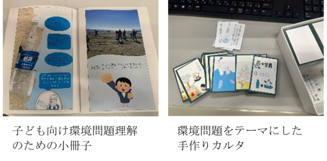 今回ブース出展する学生4名は、環境ゼミ入室当初からごみ問題に興味を持ち、海洋汚染の現状に着目・研究を行っています。本学ブースでは、海洋保全を意識してもらうため、学生手作りのアイテムや啓蒙冊子などの制作物と活動の軌跡を展示します。