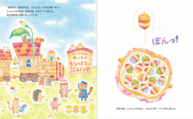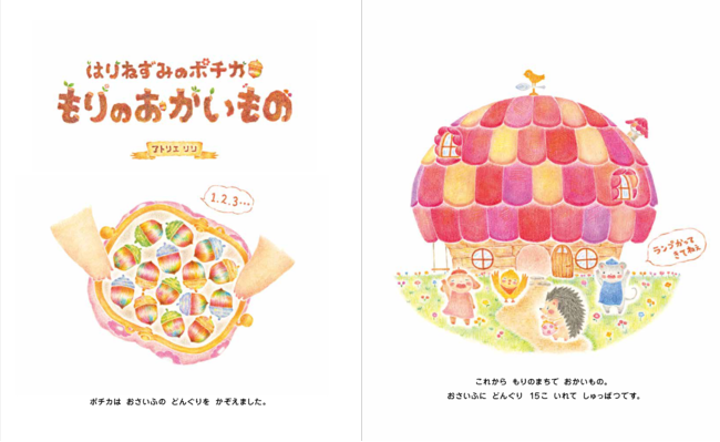 そんなポチカと一緒にどんぐりを数えて数を学び、「商品とお金の交換」という基本のルールを、物語を楽しみながら子ども達に伝えるのがこの絵本の特徴。