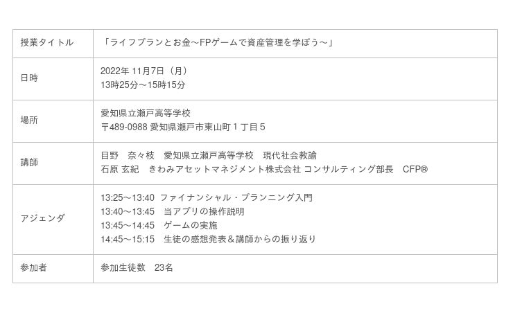 今回の金融教育授業は、ナビナビ資産運用デザインゲームを使用したチームでのロールプレイング形式で、指定された職業設定の人物を演じて生涯の「ファイナンシャル・プランニング」を疑似体験し、資産運用を楽しく学べるような内容となっています。
