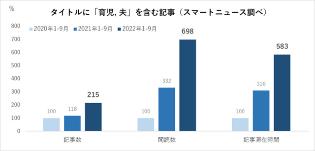 (グラフ)タイトルに「育児, 夫」「イクメン」を含む記事の、記事数、閲読数、記事滞在時間について、2020年1-9月の数値を100%として比較。記事数は、ここ2年でそれぞれ2.1倍と1.1倍に増加。閲読数と記事滞在時間は、記事数以上に増加しており、「育児, 夫」の記事は、閲読数で約7倍、記事滞在時間では約5.8倍と急増しています。