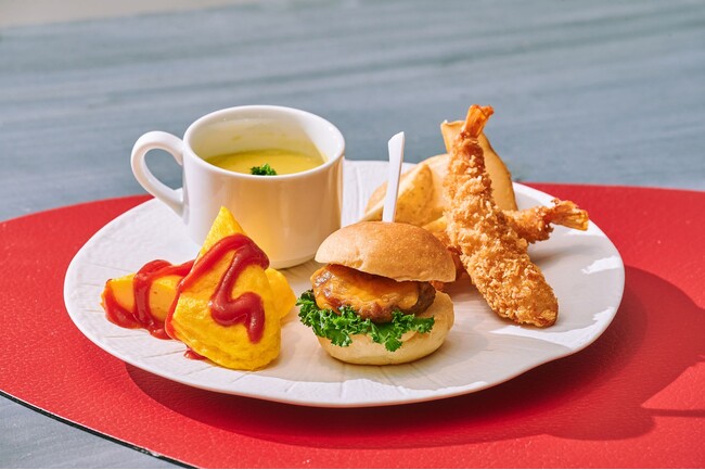 ・フード:コーンスープ/TAVERN特製ミニバーガー BBQソース/海老フライ/ミニオムレツ
