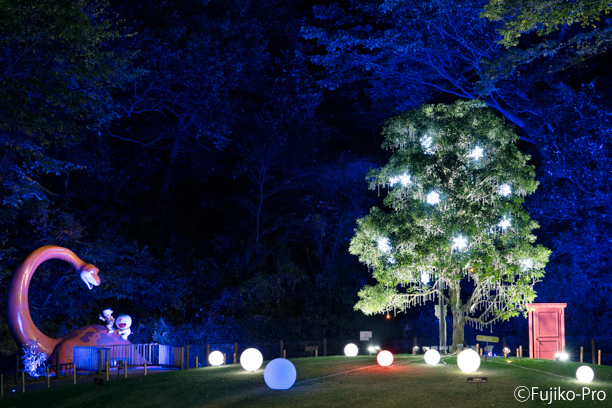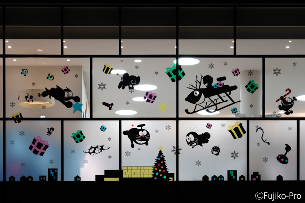 また、2F「みんなのひろば」の大窓には、藤子・F・不二雄ワールドを彩るキャラクターたちのシルエットが登場しているほか、3F「はらっぱ」の「クリスタルツリー」は、夕暮れ後にはライトアップされ、「ひかりのはらっぱ」に変身し、クリスマスシーズンをロマンチックに彩ります。