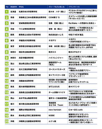 10周年を迎える今年度は、過去最多の参加校数455校・応募総数4,996件となりました。激戦を勝ち抜いたこのベスト20プランの中から、今後、更にファイナリストとして10組を選び、最終審査会(2023年1月8日開催予定)においてグランプリを決定します。