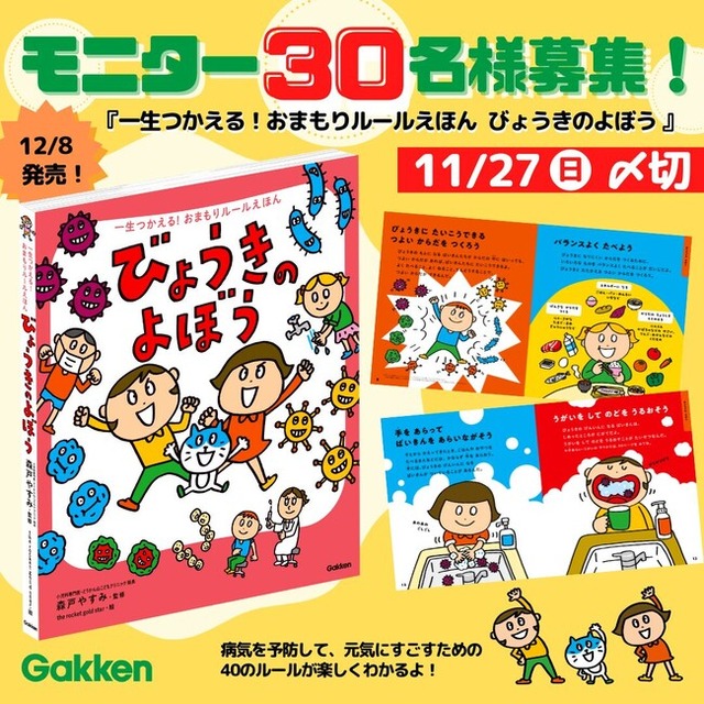 株式会社 学研ホールディングス(東京・品川/代表取締役社長:宮原博昭)のグループ会社、株式会社Gakken(東京・品川/代表取締役社長:五郎丸徹)は、2022年11月18日(金)に、絵本『一生つかえる!おまもりルールえほん びょうきのよぼう』の発売前モニターの募集を開始しました。全国の書店・ネット書店にて予約も受け付け中です。