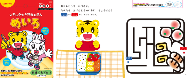 特長:スタートからゴールまで、はみ出さないように指で道をたどる練習から、運筆練習、迷路へとステップアップしながら学んでいきます。迷路では、先を見通したり、条件に合わせて進んだりする練習を通して、論理の基礎力を養います。また、「しまじろう家族のお出かけ」のストーリーの中で、擬似的な社会体験もできます。