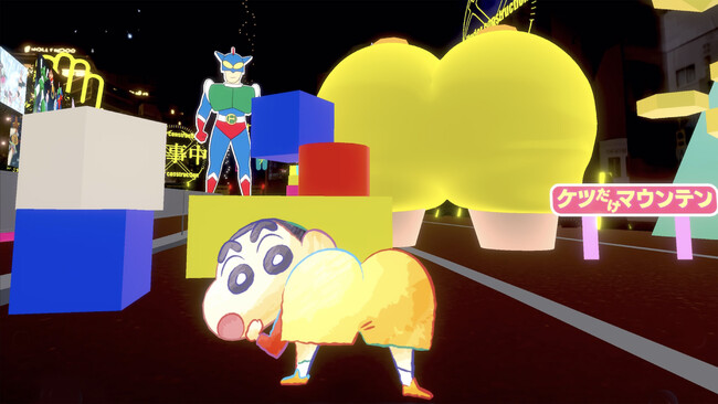 メタバース六本木内のけやき坂下エリアには、これまで30年間放送してきた名場面を並べた『ケッさくシーンギャラリー』 が登場!しんちゃんのおしりシーンに着目し、地上波や映画上映してきた名場面をずらっと展示!さらに、クレヨンしんちゃんではかかせない「アクション仮面」がメタバース上で3D化に挑戦!巨大化した“でかアクション仮面”も登場!アバターで入場すればアクション仮面にも登れる、メタバースならではの豪華施策!さらにさらに、「ケツだけマウンテン」 というオリジナルアトラクションも登場し、てっぺんに登ると六本木の夜空へ大ジャンプ!!が出来るというこちらもメタバースならではの施策が完成しました!当日の参加者は、全員しんちゃんアバターに変身できるという子どもから大人まで遊べるしんちゃん一色のイベント!この機会にたくさん写真を撮ってTwitter・InstagramなどSNSでたくさんつぶやいてみてくださいね。11月20日(日)~来年1月中旬まで、毎週土日限定オープンです! 30周年を記念した『クレヨンしんちゃん』の世界に沼れる期間限定のしんちゃんワールド。どうぞこの機会に、メタバース空間で遊んでみてください!