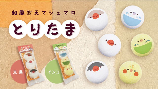 今秋新発売された商品は、国産特製寒天を使用した『和風マシュマロ』とおつまみとして馴染み深い珍味『焼きかま』2種の合計4種類です。通販サイトやことりカフェ心斎橋、小鳥の物販催事(一部)等で取り扱いを開始いたしました。