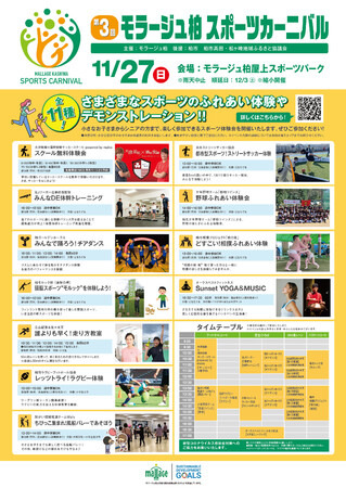 双日商業開発株式会社(東京都中央区 代表取締役 柏木広喜)が運営する「モラージュ柏」(千葉県柏市)にて『第3回 モラージュ柏 スポーツカーニバル』を開催いたします。本イベントは“スポーツを通して育む地域の輪、子どもたちの輝く未来”をモットーに、地域の各種スポーツ団体および町内会のご協力のもと、新たな地域文化の育成を目指し立ち上げました。どなたでも気軽に様々なスポーツが体験できる場として、地域のお子さまやご家族連れの皆さまを中心に大変ご好評をいただいております。小学生児童から絶大な人気を誇る陸上選手による「かけっこ教室」やリーグワンでも話題の「ラグビー体験」、元Jリーガー近藤直也氏監修の「体幹トレーニング」、ハンドパンの生演奏でヨガを楽しむ「YOGA&MUSIC」など、今回も魅力的なコンテンツが勢ぞろいです。ぜひ、奮ってご参加くださいませ。