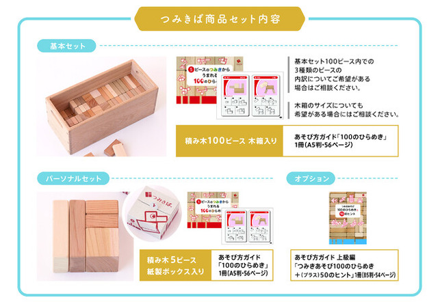 「つみきば」新ラインアップ構成として、基本のあそび方ガイド(書籍)「5ピースのつみきからうまれる100のひらめき」がついた「基本セット」と「パーソナルセット」、そしてオプションとして上級編のあそび方ガイド(書籍)「つみきあそび100のひらめき+(プラス)50のヒント」をご用意しました。