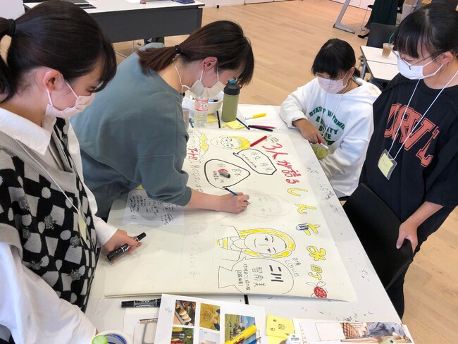 新富在住の3名のゲストの話を聞き、ゲスト一人ひとりのキャラクターや話した内容を、グループごとに模造紙に書いてまとめていきました。