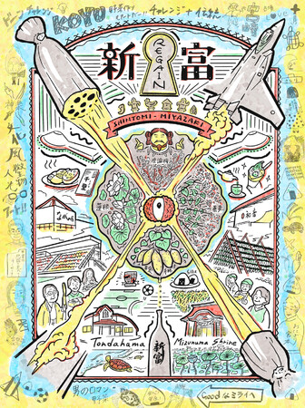 参加者が描いた絵や文字を加えて、新富初訪問だった渡辺さんが描いた新富のグラレコがこちら。
