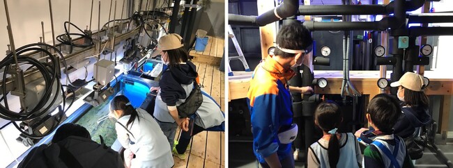 表側の水族館の雰囲気とは少し違った環境で、子供たちも少々緊張気味。バックヤードは生き物の命を繋ぐための場所でもあり、お仕事中の飼育員さんの目も真剣です。