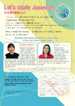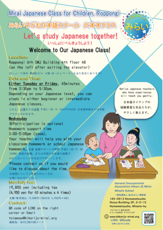 日本国内、海外両方の子どもたちに日本語のオンラインレッスンを提供してきた一般社団法人光JSみらいが、その経験を活かして対面レッスンを開始します。オンラインレッスンでは多くの保護者の方から顧客満足度アンケートで高い評価を頂いてきました。