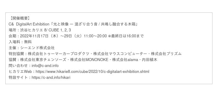 東急株式会社が運営する高層複合施設・渋谷ヒカリエ8階の「8/ CUBE 1,2,3」にて、11月29日(火)まで、デジタルアート展『光と映像 ー 混ざり合う音 / 共鳴し融合する木箱』を開催中