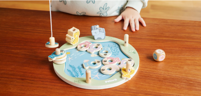 釣り堀と、12匹の魚、2本の釣り竿、サイコロのセット。魚は磁石で簡単に釣れるのではじめての釣り遊びにぴったり。サイコロと同じ数字の魚を捕まえるゲームも楽しめます。